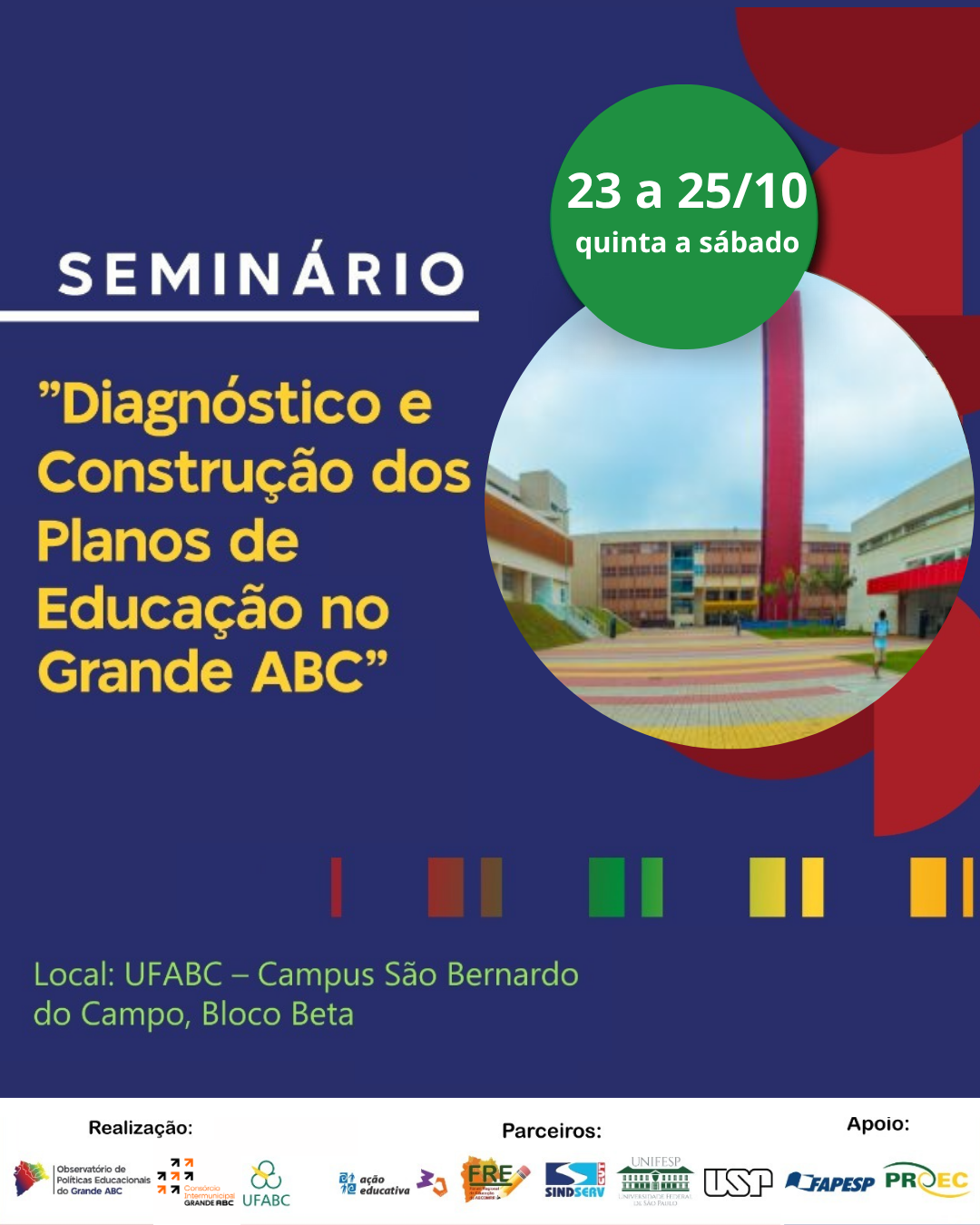 O Observatório de Políticas Educacionais do ABC vai reunir, de 23 a 25 de outubro, gestores, educadores, estudantes, movimentos sociais e representantes da sociedade civil para debater os rumos da política educacional do país e da região. O assunto será tema do Seminário Diagnóstico e Construção dos Planos de Educação no ABC, no campus São Bernardo do Campo da Universidade Federal do ABC (UFABC).
