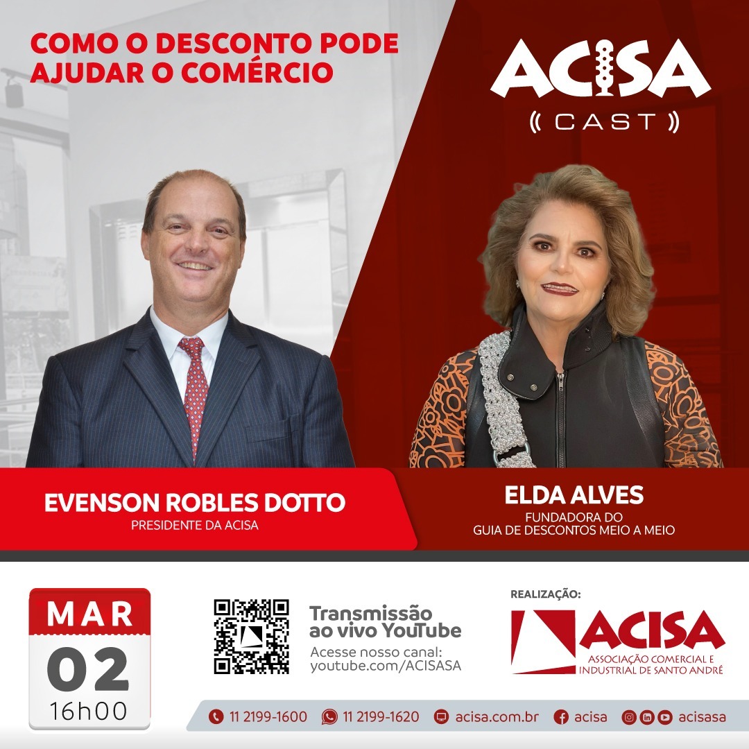 O programa será transmitido ao vivo pelo canal da ACISA no YouTube (https://www.youtube.com/user/ACISASA) na segunda-feira, 2 de março, às 16h. Na ocasião, o presidente da ACISA, Evenson Robles Dotto, recebe no estúdio Elda Alves, fundadora do guia de descontos Meio a Meio, que reúne serviços, comércio e gastronomia da região do ABC.