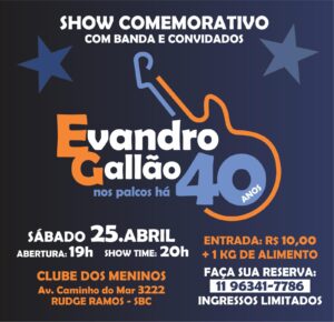 Para marcar quatro décadas de trajetória artística, o professor, publicitário e músico Evandro Galão prepara uma apresentação especial neste sábado (25), no tradicional Clube dos Meninos, localizado no bairro Rudge Ramos, em São Bernardo do Campo. O evento promete ser uma noite de celebração, memória e muita música, reunindo amigos, fãs e admiradores de sua caminhada pelas estradas, especialmente na região do ABC Paulista.