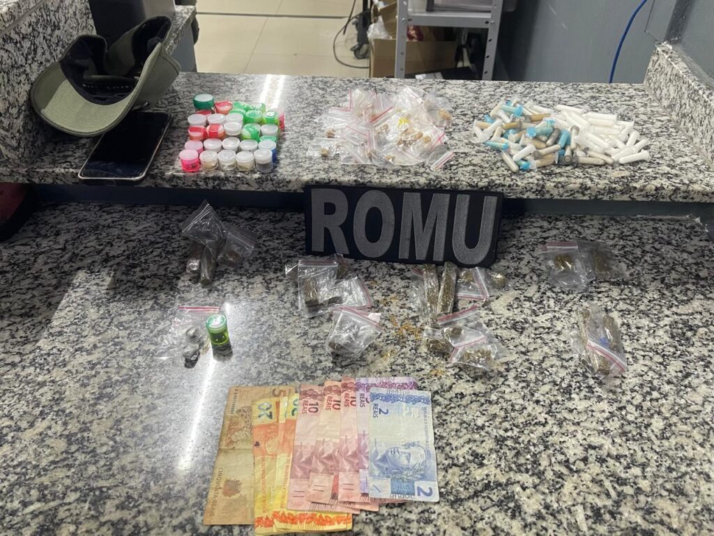 Ao avistar a viatura da ROMU, o homem agiu de forma suspeita, começou a correr e a dispensar objetos que portava pelo caminho. Os guardas alcançaram o indivíduo e, em consulta via rádio, verificaram que já possuía ficha por tráfico de drogas.