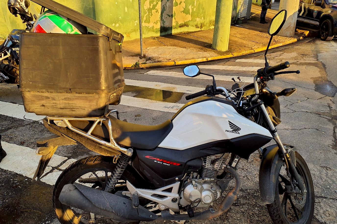 Durante patrulhamento pela Avenida Guido Aliberti, os GCMs da ROTAM (Rondas Táticas com Apoio de Motocicletas), atentos à movimentação da via, observaram pelo retrovisor da viatura um motociclista em uma Honda/CG 160 que, ao notar a presença da equipe, retornou pela contramão de direção.