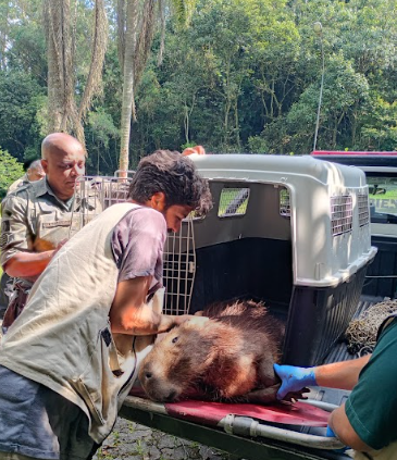 No local, os agentes avaliaram a situação e constataram que, em razão dos ferimentos e do porte do animal, seria necessária a sedação para garantir uma captura segura, tanto para a capivara quanto para os profissionais envolvidos. Diante disso, a equipe entrou em contato com o médico veterinário responsável pelo Zoológico do Parque Estoril, que prontamente prestou apoio à operação.