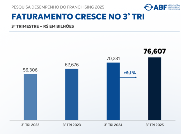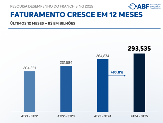 A Pesquisa de Desempenho Trimestral do Franchising referente ao período de julho a setembro de 2025 envolveu uma base amostral com 409 redes respondentes que representam aproximadamente 40% do faturamento e 31% das operações de franquias. Abrangendo o mercado como um todo, inclusive não associados, os números do desempenho do franchising são apurados em pesquisa por amostragem, cruzados com levantamentos feitos por entidades representantes de setores correlatos ao sistema de franquias, órgãos de governo, instituições parceiras e de ensino. Auditados por empresa independente, os dados divulgados pela ABF são referência para órgãos governamentais de diversas esferas, entidades internacionais do franchising, como World Franchise Council (WFC), Federação Ibero-Americana de Franquias (FIAF) e instituições financeiras