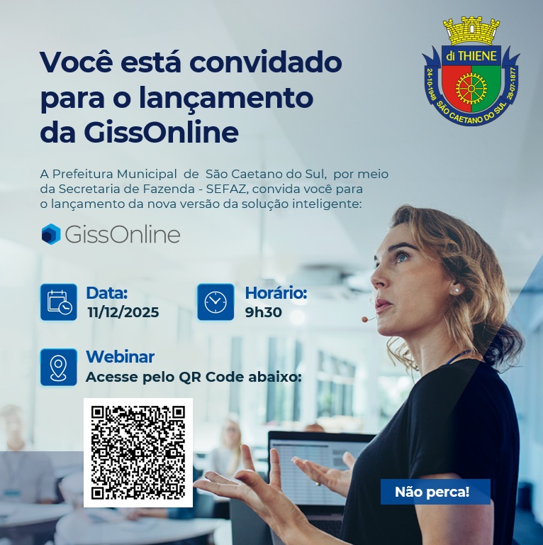 A Prefeitura de São Caetano, por meio da Secretaria da Fazenda, fará a apresentação oficial da nova versão do sistema GissOnLine em um webinar gratuito na próxima quinta-feira (11/12). A nova versão da plataforma GissOnLine será implantada em substituição ao sistema atual e ao portal de emissão da NFS-e (Nota Fiscal de Serviço Eletrônica) para facilitar a rotina tributária dos contribuintes.