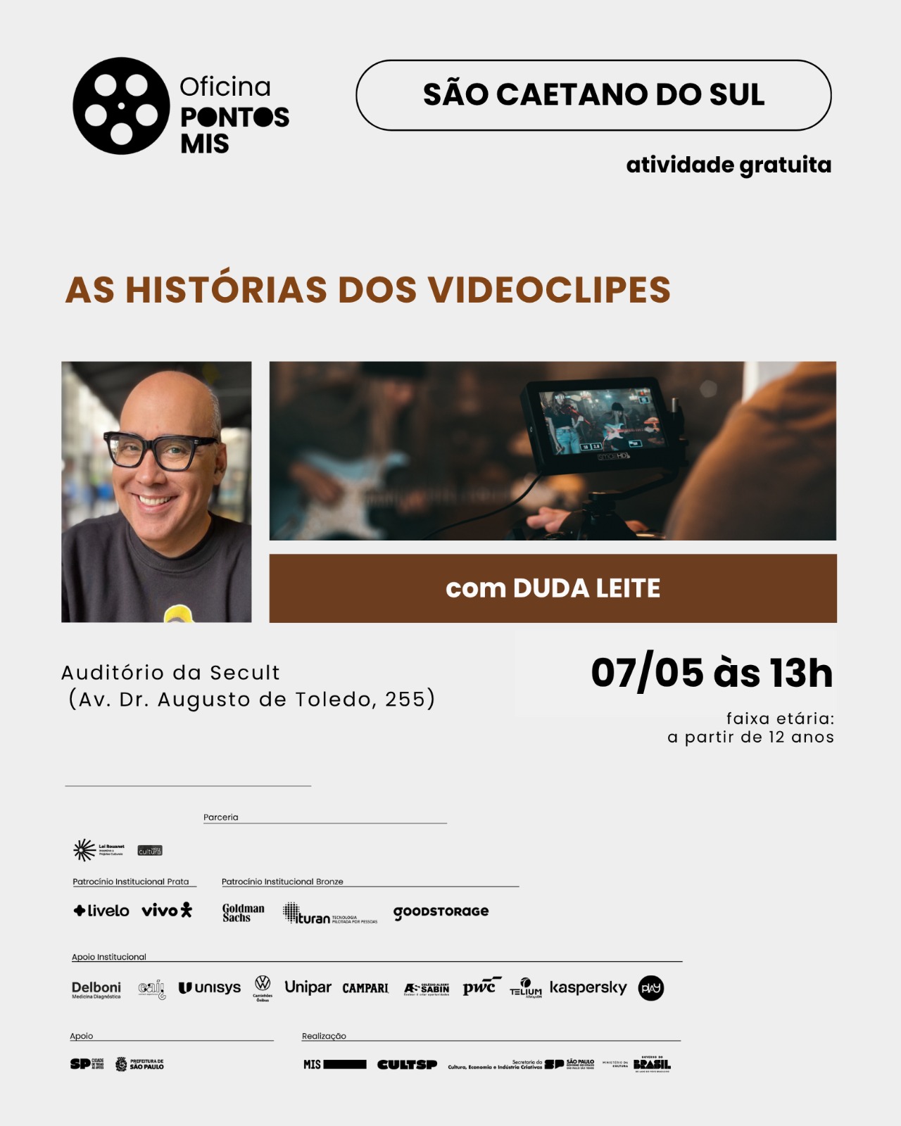 No próximo dia 7 de maio, quinta-feira, às 14h, a oficina será As Histórias dos Videoclipes. O curso vai abordar, a partir de uma perspectiva histórica, a evolução dessa bem-sucedida combinação entre áudio e visual: dos primórdios do cinema até as mais modernas tecnologias de realidade virtual e realidade expandida, usadas por vários artistas contemporâneos para proporcionar uma experiência imersiva aos espectadores.