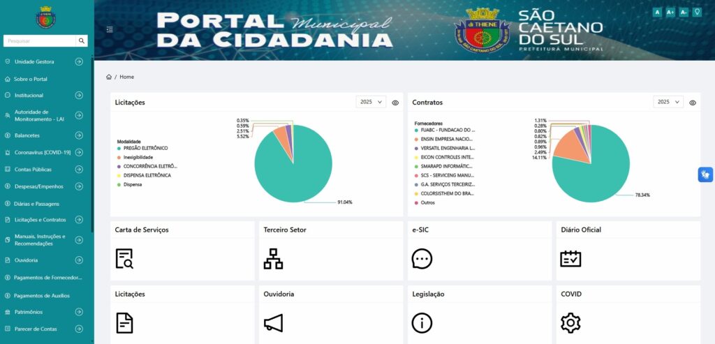 Dentre os itens que receberam melhor pontuação em 2025, encontram-se, por exemplo, informações relacionadas a licitações, contratos, obras e recursos humanos da Prefeitura. O atendimento ao cidadão com a classificação 100% em acessibilidade e um aumento significativo no percentual do critério SIC (Serviço de Informação ao Cidadão) merecem destaque, pois demonstram a melhoria no atendimento das demandas em Lei de Acesso a Informação.